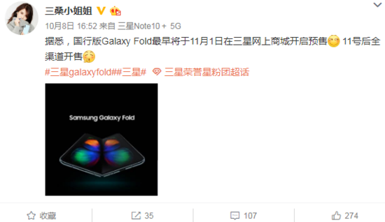 “据悉,国行版Galaxy Fold最早将于11月1日在三星网上商城开启预售,11号后全渠道开售”。