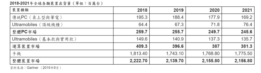 根据国际研究暨顾问机构 Gartner 预测,2019 年个人电脑(PC)、平板和手机等装置全球出货量将下滑 3.7%。其中,目前全球使用中的手机数量超过 50 亿支,在历经多年成长后,智慧型手机市场已经接近转折点。2019 年智慧型手机销售量将下滑 3.2%,面临该装置市场历来最大跌幅。