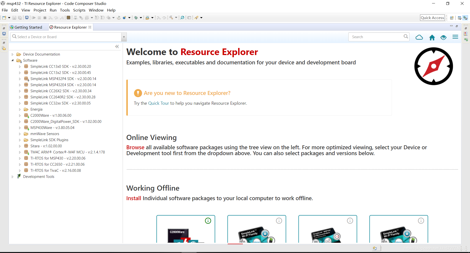首先,打开CCS,点击view,然后点击resource explore,点击SimpleLink MSP432P4-SDK -v2.30.00.14