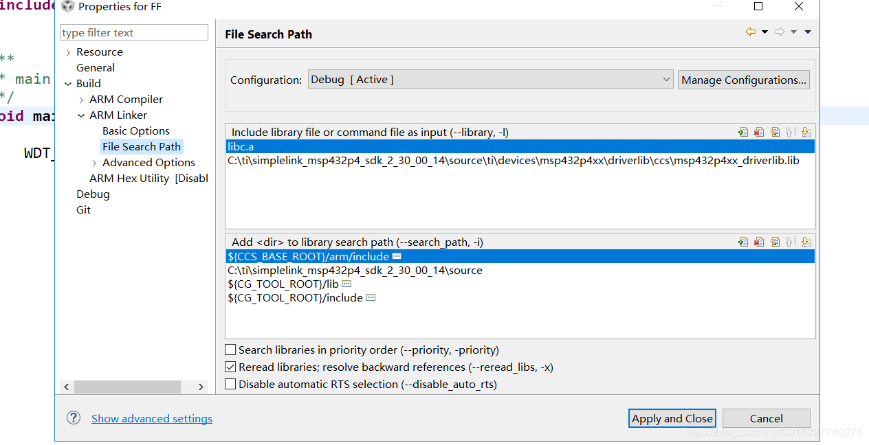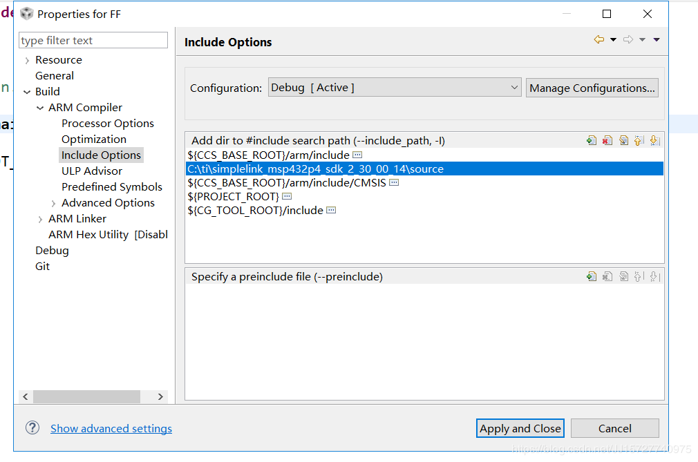 添加库函数文件的路径,我的是默认路径 C:tisimplelink_msp432p4_sdk_2_30_00_14source,添加进去。