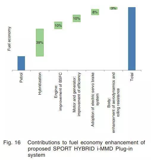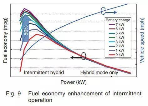 此图说明,巡航时缓慢提速,引擎模式比混动模式经济12%,但在高负荷工况下,混动模式更经济。