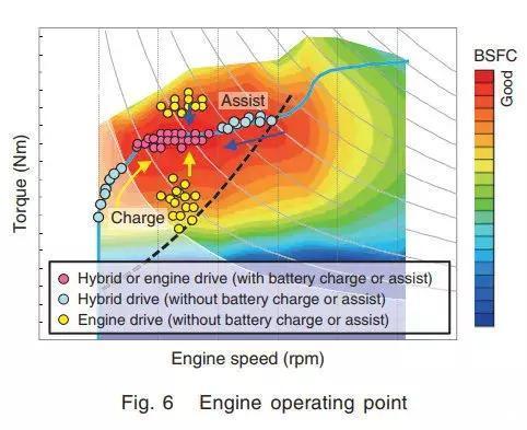 通过电动机的输出和回收,将引擎工作点集中在经济区间。