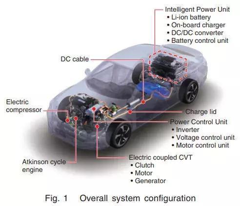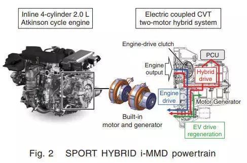 图1显示该系统的主体结构。eCVT变速器由一个发电机,一个电动机,以及一个离合器组成,该变速器如此之小,可与全新阿特金森引擎一同整合到引擎室中。