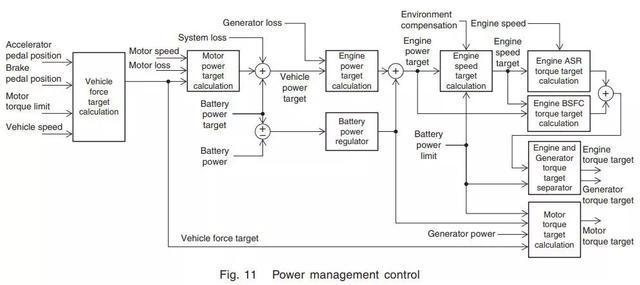 PCU首先依据车主加减速意图和电动机扭矩极限来计算所需驱动力,然后计算目标引擎功率。目标引擎功率要与依据驱动力计算的目标电机功率和IPU计算的目标电池功率相匹配。目标引擎功率根据需要,由电池功率调节器进行校正。在这之后,依据校正的目标引擎功率算出目标引擎转速和目标引擎扭矩,以使得引擎效率最大化。最后,综合考虑电池功率极限等各种限制因素,校正引擎功率,发电机功率和电动机功率。