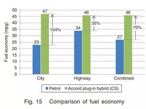 EPA实测,市区油耗降低104%,高速油耗降低35%,综合油耗降低70%,混合动力系统的控制为燃油经济增强效应贡献了39%,此外,可实现20公里纯电续航,电量消耗模式下可实现百公里2.04升等同油耗。