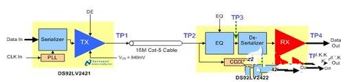 如图2a所示,美国国家半导体新一代的Channel Link II SerDes,在串行器DS92LV2421的发送阶段即有去加重功能;而在解串器DS92LV2422的接收阶段则有电缆均衡功能。框图下所示(图2b)的是当运行数据率为1.8Gbps,在信号路径上的三个测试点的模拟信号。左侧图片所示的是在去加重关闭的情况下,TP1处的波形,此时设定为-3.3dB。为了补偿预计在传输介质上会出现的高频损耗,在发送端进行了去加重补偿。在Channel Link II器件中,去加重和EQ都由寄存器控制,有8个设定值。如TP3处的数据所示,使用去加重和EQ可产生显著的效果。在VOD=840mV(在TP1处的差分输出电压)时,无去加重或EQ信号,在TP3的幅度是290mV,抖动是403pS。而当信号DE=-3.3dB,EQ=3.3dB时,幅度是825mV,抖动是142pS。