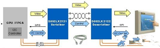 图5所示的是工业用SerDes的一个更简单灵活的应用,用于实现显示器与图像或视频处理器的远距离沟通。本例中,视频处理器包含21位的并行总线和显示器,显示器是一个由I2C控制的触摸屏,装在15米外。与上面的例子相同,数据、时钟和I2C总线都被串行到数据负载为1.05Gbps(21×50MHz)的单差分对,具有很大的设计灵活性。在低成本媒介、远距离或点对点的数据传输等多种应用中,均可以使用这种SerDes。