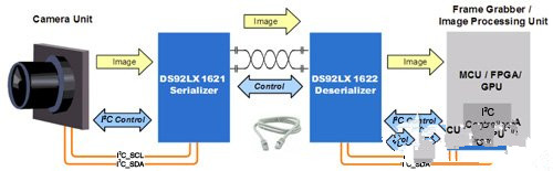Channel Link III器件DS92LX1621和DS92LX1622是SerDes的最新产品,解决了以往的所有问题。图4显示的串行器可以直接连接到16位LVCMOS并行总线摄像头,该摄像头可在单向交流耦合CML通道上串行数据。其中,摄像头的时钟和双向I2C控制线也可编码到串行数据中。串行数据、时钟和I2C总线通过带有分立时钟的16位并行总线实现解串,经I2C接口到帧接收器或FPGA的接收端。解串器无需额外的外部时钟,这既降低了成本,也降低了设计难度。此外,解串器与串行器自动同步功能使其实现了真正的“即插即锁”功能。