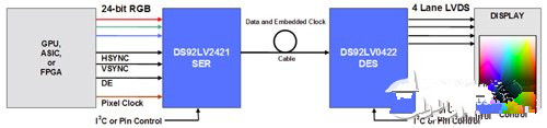 工业用SerDes不仅应用广泛,还具有高度的灵活性。在图4和图5中,串行和解串前后的数据格式是一样的。使用该SerDes转化数据格式时,仅靠解串器即可完成数据格式的转化。图6显示了DS92LV2421的工作流程,通过分立合成器、时钟和控制信号接收24bit RGB数据,而后把数据串行到一个差分对上。其线缆接收端的数据即被DS92LV0422解串到4路LVDS通道和一路时钟信道上。