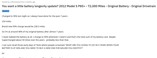 无论是手机、笔记本电脑还是电瓶车,都让我们对锂电池的寿命有了深刻的理解,尤其“锂电池的寿命大约为【500次充放电】,一旦超出便会寿终正寝”的说法相信不少人都有所耳闻。于是不少电动车的观望者也曾十分担心汽车电池会不会在使用五年之后就会迅速老化,损耗达到50%甚至更高。然而两个月前,网友发帖:他2012年拿到的Model S,经过72,000英里后,依然还能达到98%的充电量。