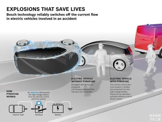 比如博世(Bosch)开发了一种全新的电池安全系统CG912,运用和安全气囊类似的可控的爆炸原理:当传感器检测到碰撞时,高温保险丝(技术上称为烟火安全开关系统)将使用其微型爆炸装药以物理方式炸裂高压电池单元和车辆其余部分之间的布线部分,切断电线,从而切断电流,使乘员或急救人员可以安全地接触汽车的金属,不会因意外损坏而造成短暂的电击危险。