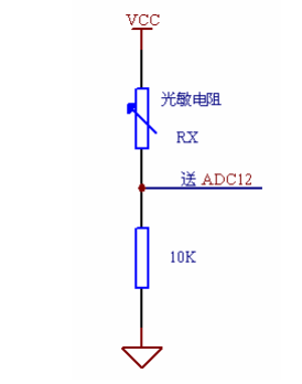 灭,而在亮度低于某个数值时亮起来。下面是简图。当亮度较大、光线较强时,光敏电阻的电阻值比较小,这时它与下面 10K 分压,则送达 ADC12 的电压比较高;而当亮度较小、光线较弱时,光敏电阻的电阻值比较大,这时它与下面 10K 分压,则送达 ADC12 的电压比较低。通过 ADC12 模块转换出具体的表示光强度的数值(光线越强,转换后的数值越大,但不成正比例),再设定一个开启路灯的阀值数据,则可以通过实际测量的光强度数据与阀值数据比较得到是否开启路灯的目的。