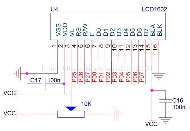 1602需三根控制线,接单片机P2口第5~7位控制线,采用8位并口接P0口。