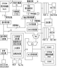 现在我们已经知道要单片机工作,就需用汇编语言编制程序。而对某个PIC单片机编程时,还需对选用的PIC单片机内部硬件资源有所了解。这里介绍PIC16F84单片机的内部结构,如图1所示的框图。由图1看出,其基本组成可分为四个主要部分,即运算器ALU和工作寄存器W;程序存储器;数据存储器和输入/输出(I/O)口;堆栈存储器和定时器等。现分别介绍如下。