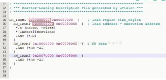 Line5:0x0000_8000表示加载域的起始地址,即放在flash0x0000_8000地址处开始放置,0x0008_0000表示代码区、数据区的总共大小的最大值,程序文件超过此值将会报错,这里取默认值0x0008_0000即可。