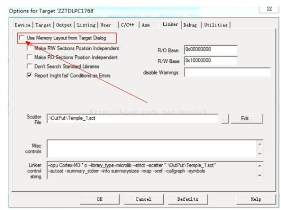 要使用此分散加载描述文件,还需要将Target Opitions…->Linker下的Use Memory Layout from Target Dialog前的“√”去掉。