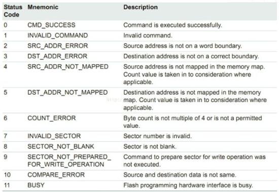 由上图可知准备写操作扇区需要三个参数,分别是Command code、Param0、Param1,返回状态码的可能取值为CMD_SUCCESS、BUSY、INVALID_SECTOR。据此我们写处准备写操作扇区的命令函数如下: