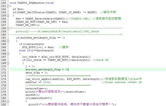IAP不是一下子把所有BIN文件都接收过来写入FLASH,而是根据自己硬件的RAM空间,把BIN文件分成若干包,如每1K,2K等传送一次,传送当中加上帧头,帧尾,CRC,及总共多少包,及这是第几包等信息封装好的数据包,每接收一包写相应FLASH,下一包对应的FLASH地址++,如此完成固件更新。