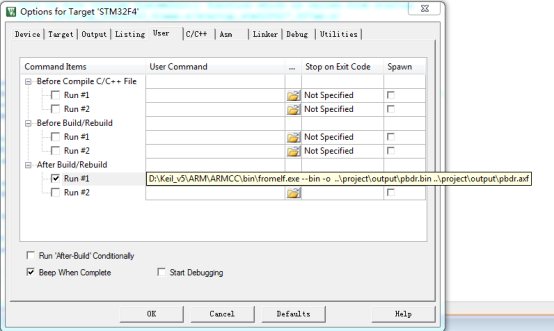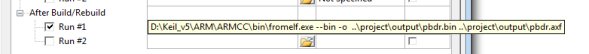 MDK编译默认生成.hex文件,而升级程序需要生成.bin文件。MDK自带的格式转换工具fromelf.exe,来实现.axf文件到.bin文件的转换。该工具在MDK的安装目录ARMBIN40文件夹下。通过下一步设置,可以在MDK编译成功之后,调用fromelf.exe (注意,MDK的安装路径,我的路径D:Keil_v5ARMARMCCbin),根据当前工程pbdr.axf,生成一个pbdr.bin文件。存放在OBJ文件夹下。在得到.bin文件后,我们只需要将这个bin文件通过串口传送给单片机,即可执行代码的下载以及升级。