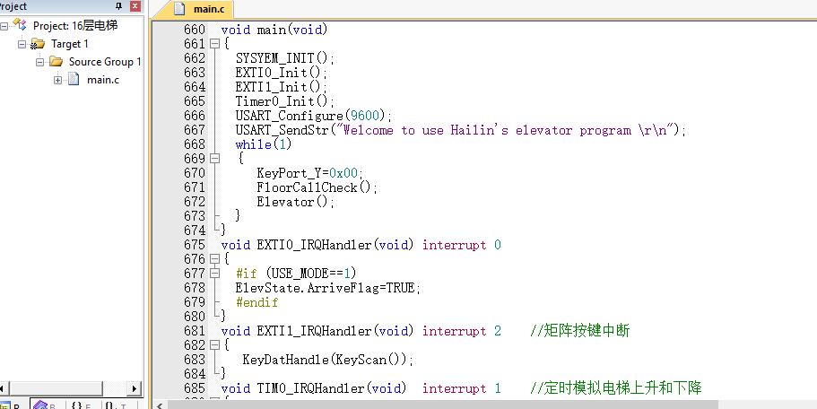 while(Timer_Second void EXTI0_Init(void) { EA = 1; IT0= 1; //下降沿触发 EX0= 1; } void EXTI1_Init(void) { EA = 1; IT1= 1; //下降沿触发 EX1= 1; } …………………… …………限于本文篇幅 余下代码请从51黑下载附件………… else if(((key>0)&&(key<=8))||((key>32)&&(key<=40))) //楼梯内的楼层选择按键(使用第1行和第5行作为电梯内部16个按键,每行8个键) { if(key>32) tempkey=key-32+8; else tempkey=key; if(tempkey<=MaxFloor) { LED_ON(LED_IN_Port,tempkey); if(((tempkey>ElevState.CurrentFloor)&&(tempkey if((tempkey } else if(((key>9)&&(key<=16))||((key>40)&&(key<=48))) //每个楼层门口外的向下按键(底楼按向下无效),第2行和第6行 { if(key>40) tempkey=key-40+8; else tempkey=key-8; if((tempkey>1)&&(tempkey<=MaxFloor)) { LED_ON(LED_OUT_DOWN_Port,tempkey); ElevState.FloorCallTable[tempkey]|=DOWN_OUT; } } else if(((key>16)&&(key<=24))||((key>48)&&(key<56))) //每个楼层门口外的向上按键(顶楼按向上无效),第2行和第7行 { if(key>48) tempkey=key-48+8; else tempkey=key-16; if(tempkey LED_ON(LED_OUT_UP_Port,tempkey); ElevState.FloorCallTable[tempkey]|=UP_OUT; } } else if(key==25) //开门 { if(ElevState.ElevRunning==FALSE) { if(DOOR==CLOSE) DOOR_Open; } }