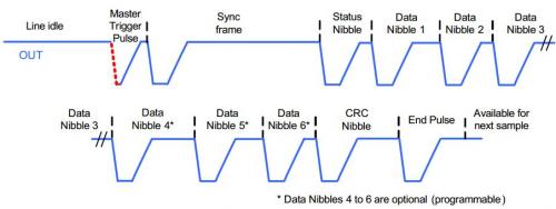 SPC协议以单线半双工传输的方式进行数据传输,最多可以同时控制4个传感器。与SENT不同,SPC新增了触发字段,可表示三种模式:同步模式,ID选择与范围选择。SPC各个字段的值根据两个下降沿之间的时间来表示一个四位的值,根据下降沿时间除以一个固定的值所得的结果减去12就是所代表的值,这个固定的值成为单位时间(UT)。