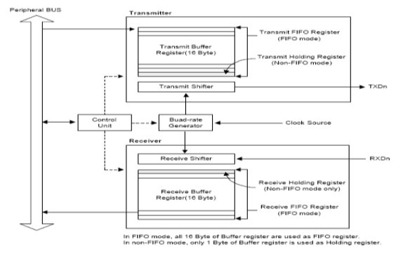 每个UART包括一个波特率发生器、一个发送器、一个接收器和一个控制单元,如图11-1所示。波特率发生器的输入可以是PCLK或者UEXTCLK。发送器和接收器包含16位的FIFO和移位寄存器,数据被送入FIFO,然后被复制到发送移位寄存器准备发送,然后数据按位从发送数据引脚TxDn输出。同时,接收数据从接收数据引脚RxDn按位移入接收移位寄存器,并复制到FIFO。