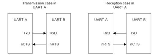 在AFC时, nRTS 由接收器的状态决定,而nCTS信号控制发送器的操作。只有当nCTS信号有效的时候(在AFC时,nCTS意味着其它UART的FIFO准备接收数据)UART发送器才会发送FIFO中的数据。在UART接收数据之前,当它的接收FIFO多于2字节的剩余空间时nRTS必须有效,当它的接收FIFO少于1字节的剩余空间时nRTS必须无效(nRTS意味着它自己的接收FIFO开始准备接收数据)。