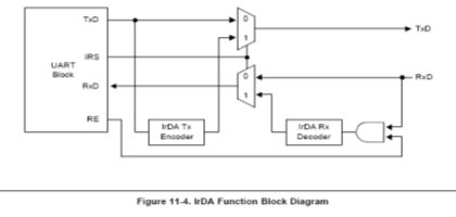 UART支持红外 (IR)接收和发送,可以通过设置UART线控制寄存器ULCONn的Infra-red-mode位来进入这一模式。图11-4阐述了如何实现IR模式。