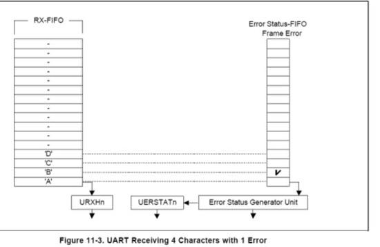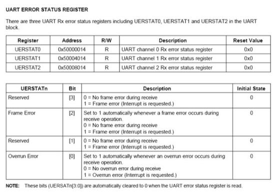 UART除了Rx FIFO外还有错误状态FIFO。错误状态FIFO指示接收到的哪个数据有错误。只有当有错误的数据准备读出的时候才会产生错误中断。要清除错误状态FIFO,URXHn和UERSTATn必须被读出。