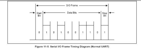 在IR发送模式下,发送脉冲的比例是3/16——正常的发送比率(当发送数据位为0的时候);在IR接收模式下,接收器必须检测3/16的脉冲来识别0值(见图11-6和11-7所示的帧时序)。