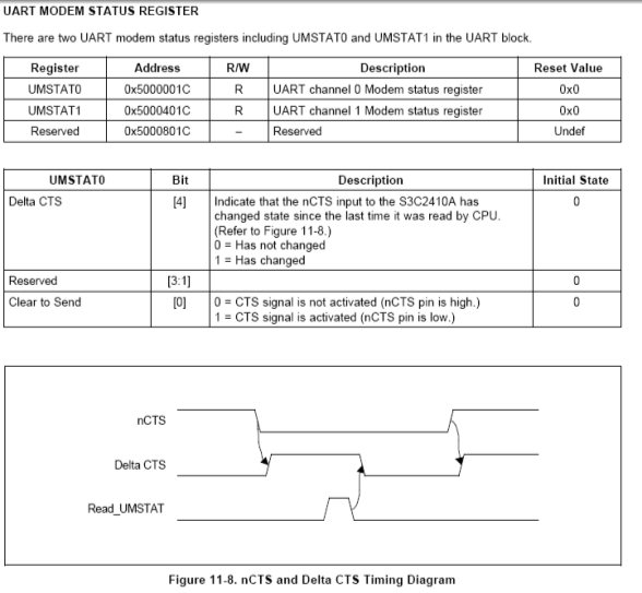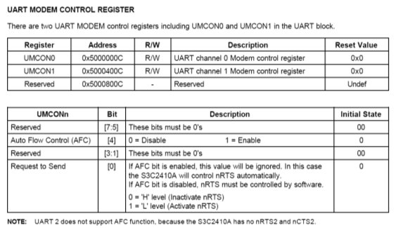 UART0和UART1通过nRTS and nCTS信号支持自动流控制,例如连接到外部UART时。如果用户希望将UART连接到一个MODEM,可以在UMCONn寄存器中禁止自动流控位,并且通过软件控制nRTS信号。