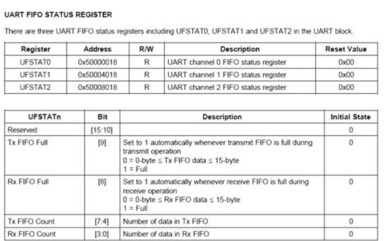 每个UART有5个状态(Tx/Rx/Error)信号:溢出错误、帧错误、接收缓冲满、发送缓冲空和发送移位寄存器空。这些状态体现在UART状态寄存器中的相关位(UTRSTATn/UERSTATn)。