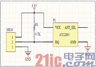 温度采集单元主要有传感器、处理器和电源组成,传感器18B20负责区域内温度信息的采集和数据转换,将温度的传感器信息经过A/D转换,得到数字信息,供处理器AX22001进行处理。其原理图如图1所示,其中ANT_SEL引脚接天线,用来传送无线信号。