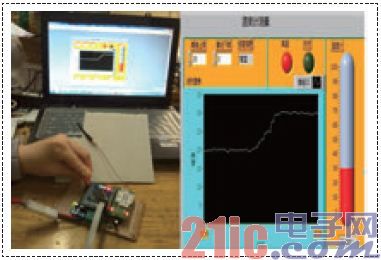 本系统对一个温度传感器传输的数据进行了测试,得到的结果和温度及所测的结果非常接近,但是其比温度计的灵敏度和分辨率要高很多。另外系统工作也非常稳定,环境的影响也很小。图3是测试的结果,其中20℃的时候为室温,温度升高是由于用手触摸传感器所致。