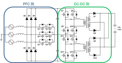 例如,210 kW 电动汽车充电点由14个15 kW模块组成,每个15 kW的电池充电器模块都是由3相交流380 V输入,经过3相Vienna 功率因数校正(PFC)后,电压升高到800 V直流电压,再经过高压DC-DC输出250 V至750 V直流电压。