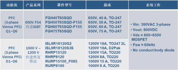 其中,3相Vienna PFC可选用安森美半导体的第3代超级结MOSFET (SUPERFET III)的易驱动(EASY Drive)/ 快速(FAST)系列,多级LLC可选用SUPERFET III 快速恢复(FRFET)系列。EASY Drive系列可内部调节门极电阻Rg和寄生电容,有极低的EMI和电压尖峰,适用于硬/软开关。FAST系列有减小的门极电荷Qg和输出电容储存能量Eoss,低开关损耗,高能效,适用于硬开关拓扑。FRFET系列集成一个高度优化的快恢复二极管,具有超低Qrr和Trr,最小化开关损耗并提高系统级可靠性,适用于软/硬开关拓扑。