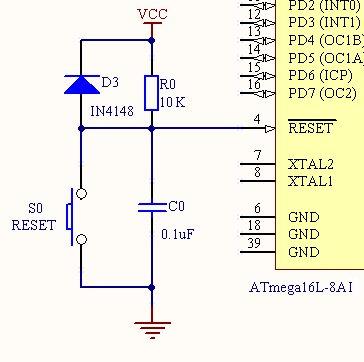 Mega16已经内置了上电复位设计。并且在熔丝位里,可以控制复位时的额外时间,故AVR外部的复位线路在上电时,可以设计得很简单:直接拉一只10K的电阻到VCC即可(R0)。