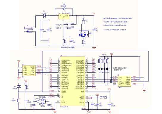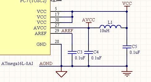重要说明:实际应用时,如果你想简化线路,可以将AVCC直接接到VCC,AREF悬空。即这部分不需要任何的外围零件。