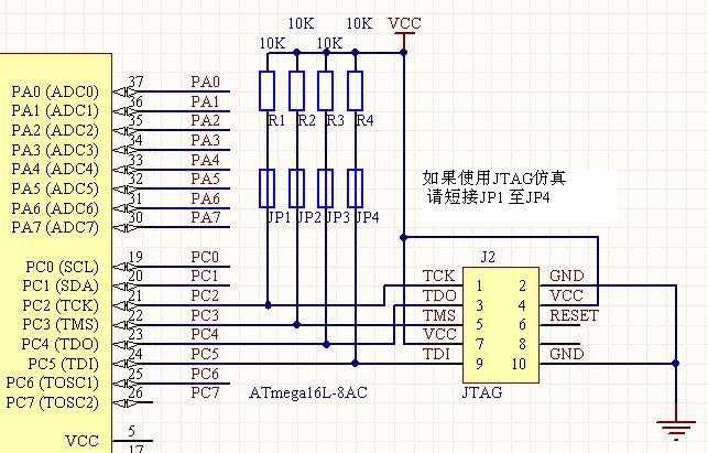 重要说明:实际应用时,如果你不想使用JTAG仿真,并且不想受四只10K的上拉电阻的影响,可以将JP1-JP4断开。