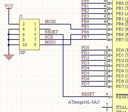 ISP下载接口,不需要任何的外围零件。使用双排2*5插座。由于没有外围零件,故PB5(MOSI)、PB6(MISO)、PB7(SCK)、复位脚仍可以正常使用,不受ISP的干扰。