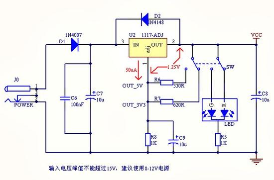 二极管D1防止用户插错电源极性。D2可以允许用户将电压倒灌入此电路内,不会损坏1117-ADJ。