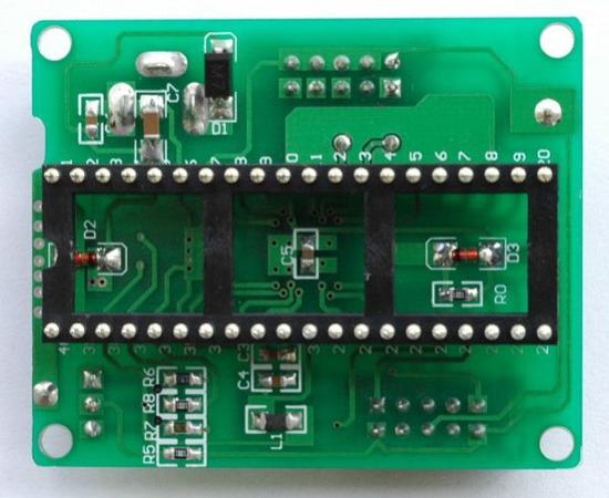 底部图:为了方便实验,我们将这块小板的输出脚,按直插ATmega16的管脚排列定义。为防止不小心掉到地上导致插针折断,加装了一只40脚的圆孔IC座做保护。如果不小心折断,可以方便地更换圆孔IC座。