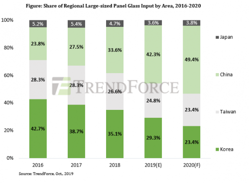 以各区域大尺寸面板投入面积的状况来看,因韩系面板厂今年大举关闭多条产线,而中国大陆面板厂新厂产能持续开出,一消一长之下让中国大陆面板厂在大尺寸玻璃投入面积占比上升至 42.3%,成为投入面积最大的区域,预计 2020 年更将逼近 50%。