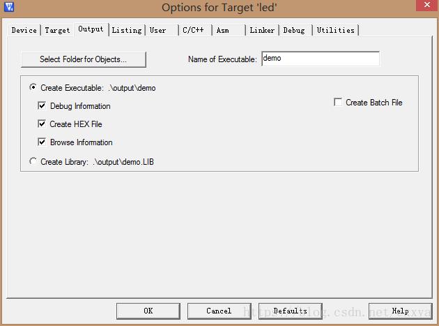 ,选择output选项卡,点击Select for Objects设置编译后的文件保存位置,即前面所建的output文件夹,其他设置修改如图。同理,点击Listing选项卡选择listing文件夹来保存生成的链接文件。
