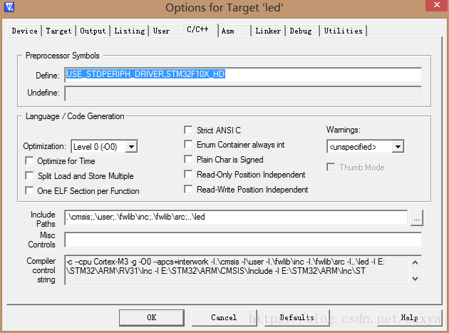 ,选择C/C++选项卡,在Define文本框中添加两个宏定义:
