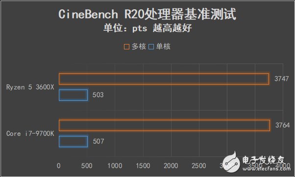 锐龙5 3600X在R20测试中的单核得分为503pts、多核得分3747pts,和酷睿i7-9700K的成绩几乎相同,微小的差别甚至可以算作误差。
