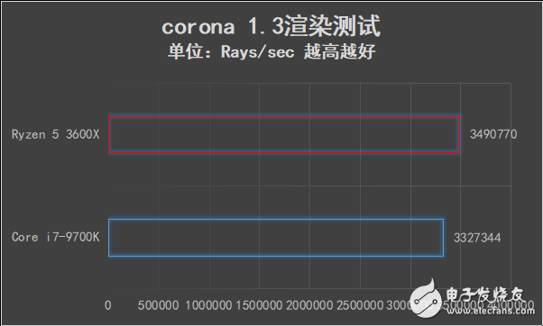 Corona Renderers是一款全新的高性能照片级高真实感渲染器,在corona 1.3版本的基准测试中,锐龙5 3600X的平均速度高达3490770Rays/sec,性能上相比酷睿i7-9700K有一定优势。