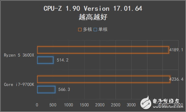 在1.90版本的V17测试中,锐龙5 3600X作为一款价格更低、核心数量更少的产品,得分依旧和酷睿i7-9700K相差无几,“Zen2”架构所带来的IPC提升、以及SMT效率显露无疑。