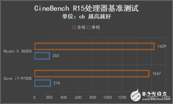 在R15测试中,锐龙5 3600X的单核心得分为203cb,不但相比二代锐龙提升很大,和酷睿i7-9700K相差无几,而凭借着极高的SMT超线程效率,多核分数上锐龙5 3600X相比价格更贵的酷睿i7-9700K还会高出一些。