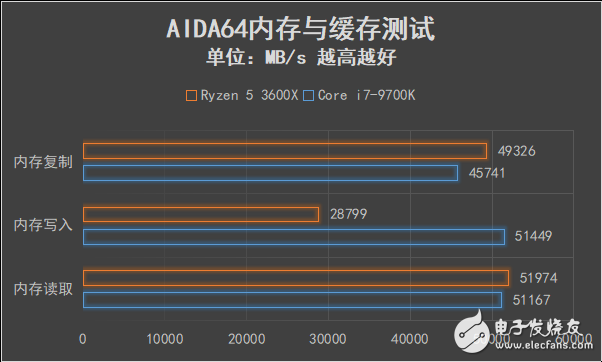 全新的“Zen2”架构改进了内存控制器,使其获得更强的兼容性,锐龙5 3600X可完美适配3600MHz C16高频内存,在AIDA64内存与缓存测试中,内存复制速度高达49326MB/s、内存读取速度高达51974MB/s,相比酷睿i7-9700K有小幅优势。不过由于锐龙5 3600X为单die设计,内存写入带宽被大幅降低,速度只有理论值的一半,但鉴于绝大多数用户很少做需要大量数据写回的密集计算,所以影响也不是很大。